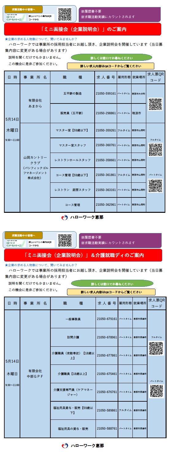 - 【ハローワーク恵那】5月14日 ミニ面接会(企業説明会)&介護就職デイのご案内