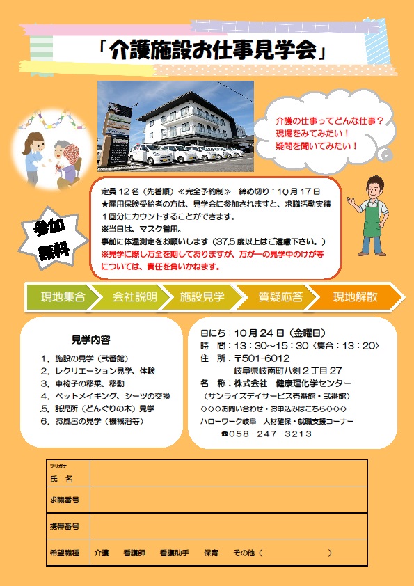 【ハローワーク岐阜】10月24日(金) 介護施設お仕事見学会のご案内《予約制》