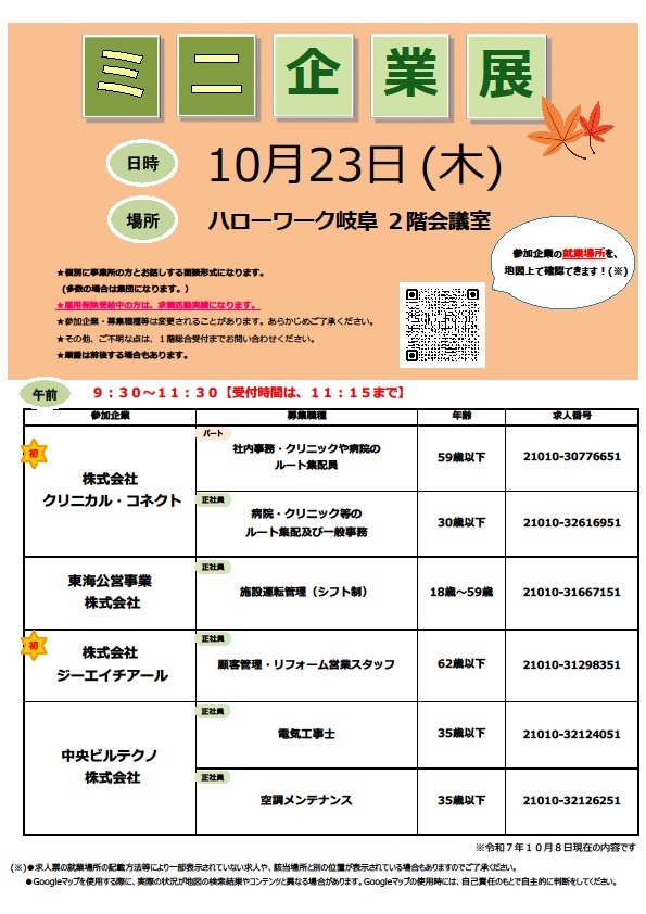- 【ハローワーク岐阜】10月23日 ミニ企業展のご案内