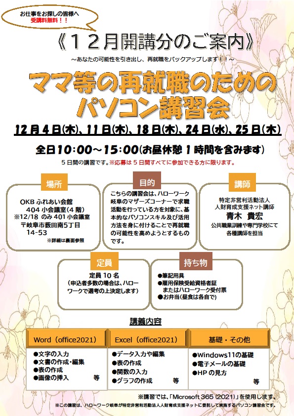 【ハローワーク岐阜】ママ等の再就職のためのパソコン講習会《12月開講のご案内》