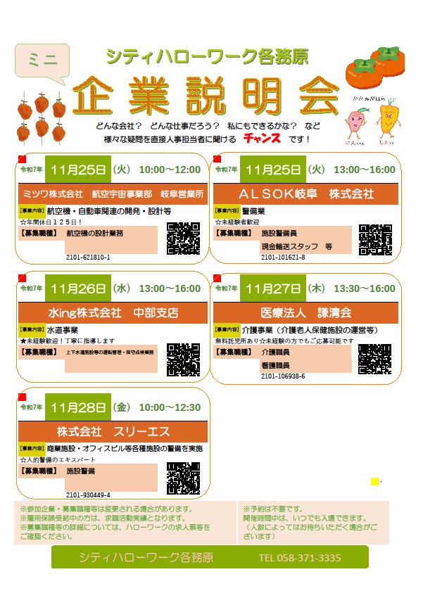 【ハローワーク岐阜】ミニ企業説明会のご案内(各務原)