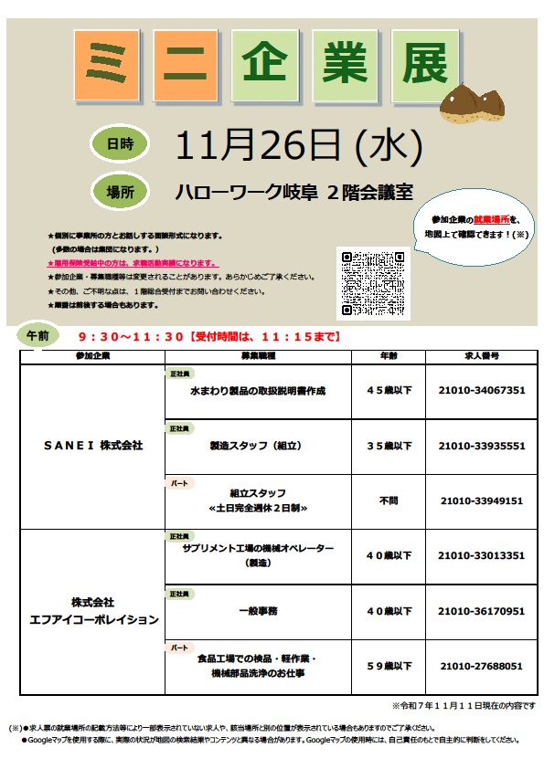 - 【ハローワーク岐阜】11月26日 ミニ企業展のご案内