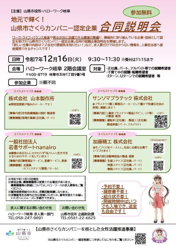 - 【ハローワーク岐阜】12月16日 地元で輝く!山県市さくらカンパニー認定企業合同説明会のご案内