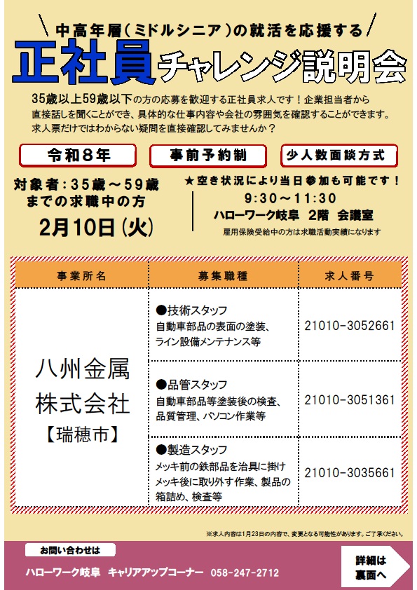 - 【ハローワーク岐阜】2月10日 正社員就労を応援する企業が参加 正社員チャレンジ説明会のご案内