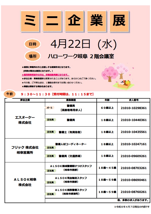 - 【ハローワーク岐阜】4月22日 ミニ企業展のご案内