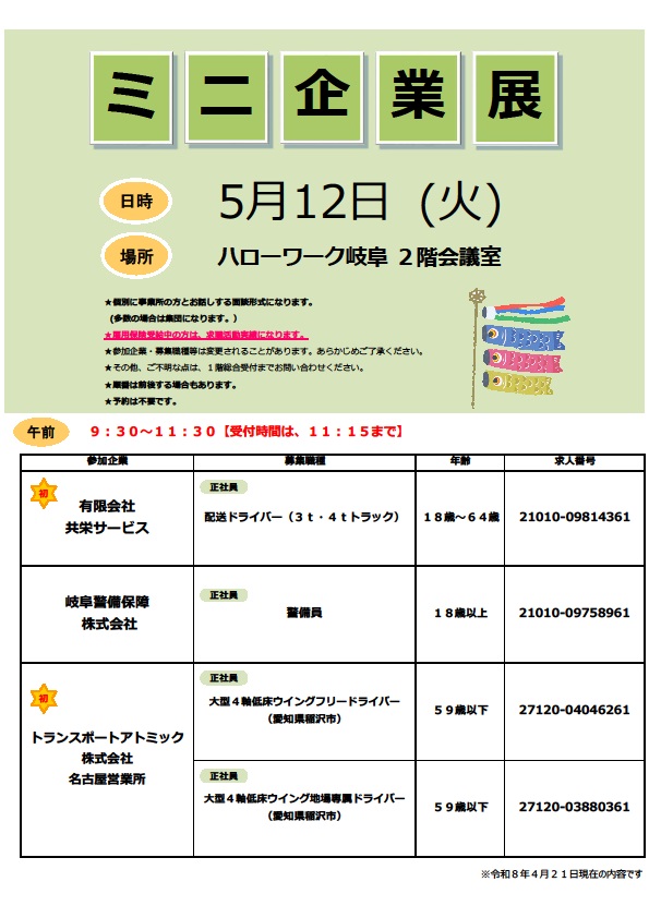 - 【ハローワーク岐阜】5月12日 ミニ企業展のご案内
