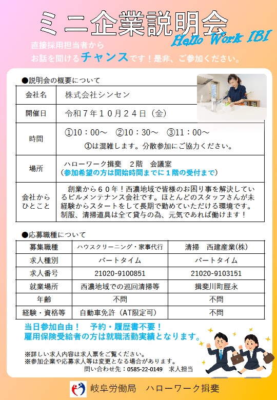 - 【ハローワーク揖斐】10月24日 ミニ企業説明会のご案内