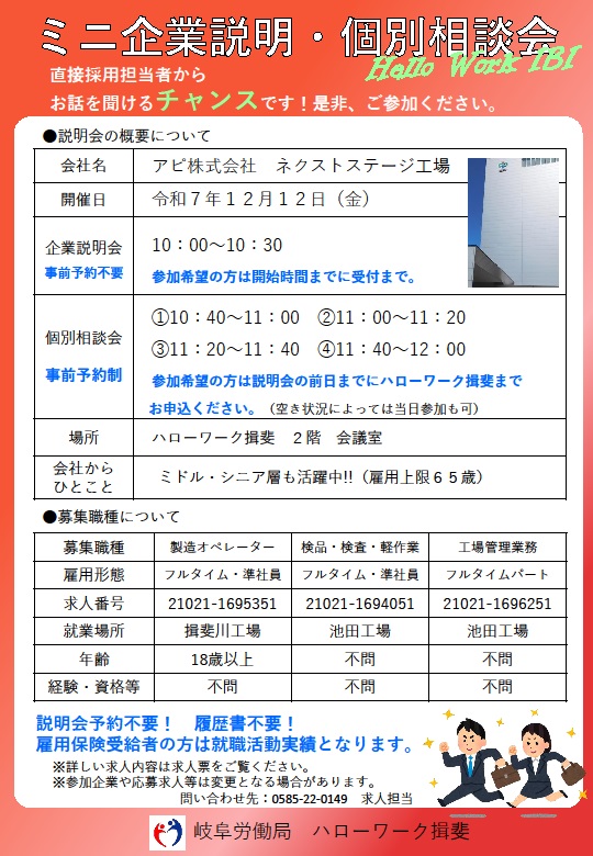 - 【ハローワーク揖斐】12月12日 ミニ企業説明会のご案内
