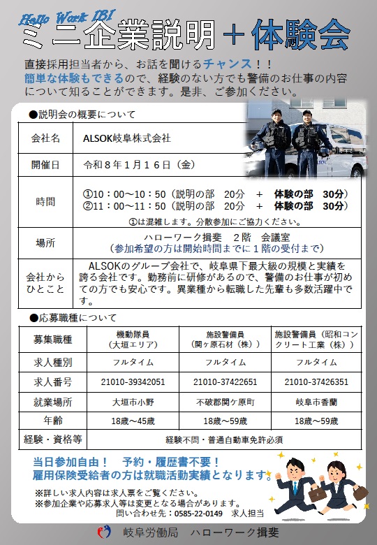 【ハローワーク揖斐】1月16日 ミニ企業説明+体験会のご案内