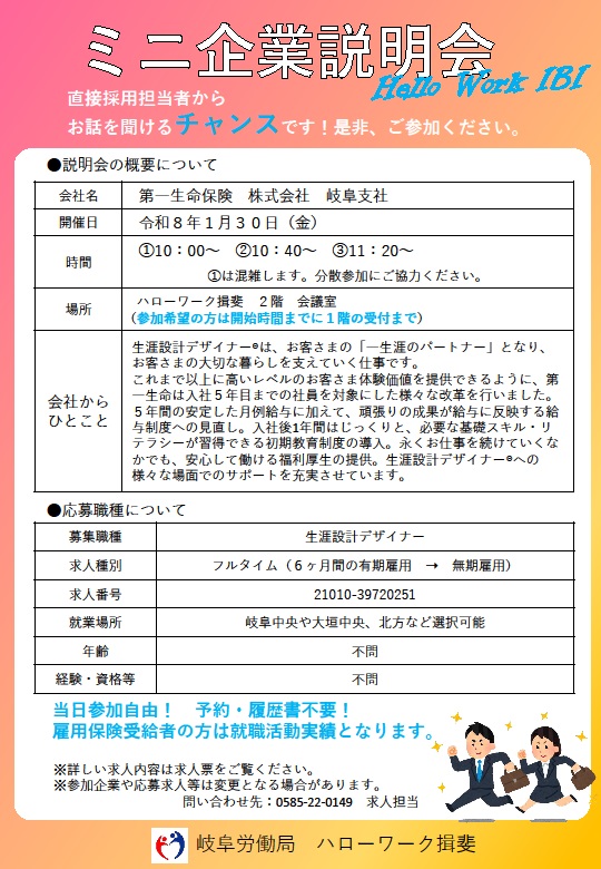 - 【ハローワーク揖斐】1月30日 ミニ企業説明会のご案内
