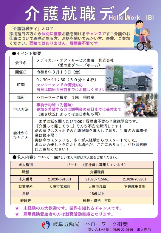 - 【ハローワーク揖斐】3月13日 介護就職デイのご案内