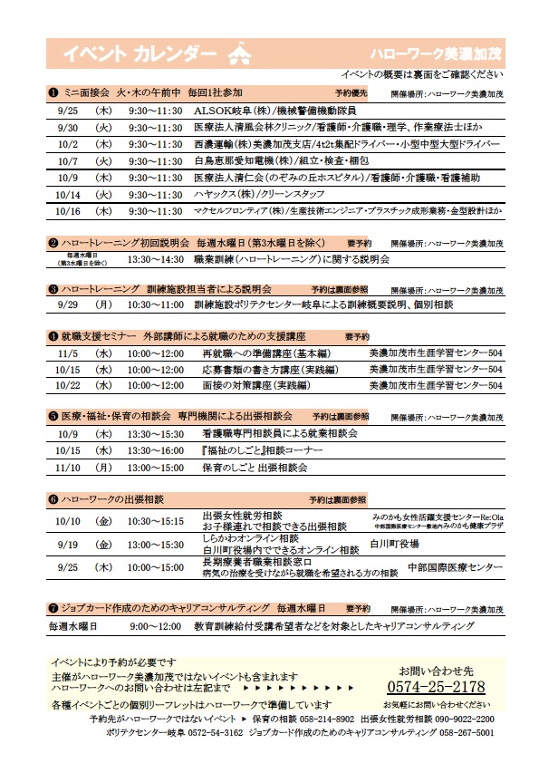 - 【ハローワーク美濃加茂】イベントカレンダー ◆9月~10月◆のご案内