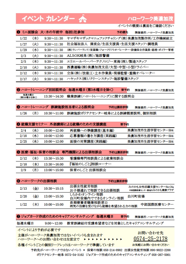 - 【ハローワーク美濃加茂】イベントカレンダー ◆1月~2月◆のご案内