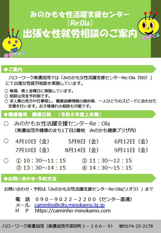 ハローワーク美濃加茂では、みのかも女性活躍支援センター Re:Ola(リオラ)において毎月第2金曜日に完全予約制による出張女性就労相談を実施しています。
