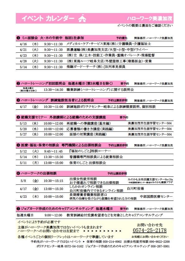 - 【ハローワーク美濃加茂】イベントカレンダー ◆4月~5月◆のご案内