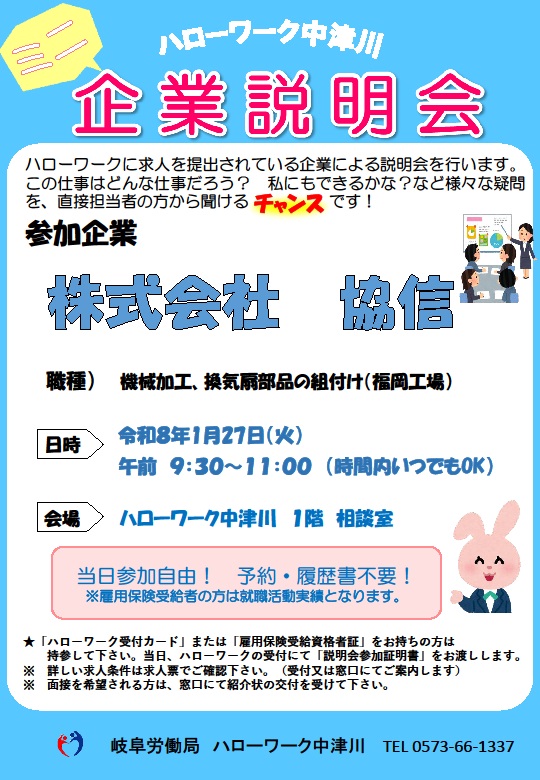 【ハローワーク中津川】1月27日 ミニ企業説明会のご案内