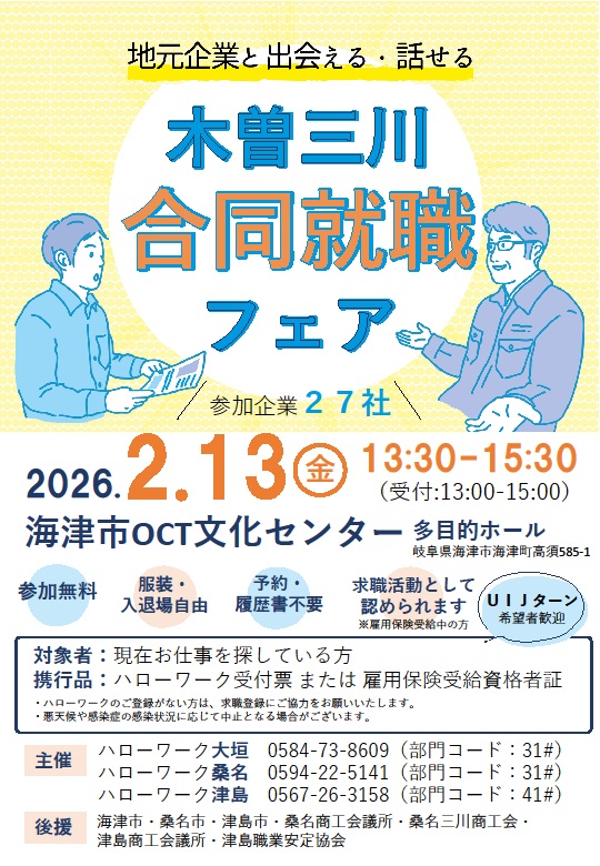 - 【ハローワーク大垣】2月13日(金) 木曽三川合同就職フェアのご案内