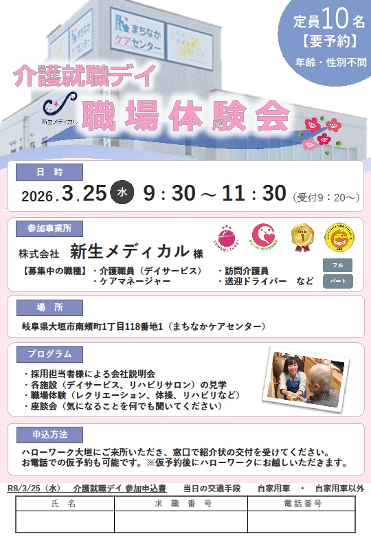 - 【ハローワーク大垣】3月25日 介護就職デイ「職場体験会」のご案内