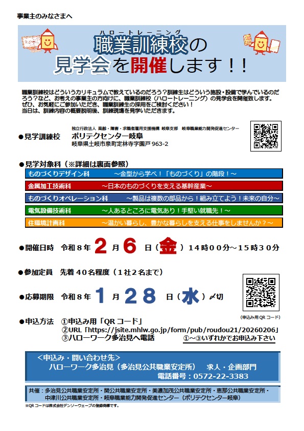 ※応募期限:令和8年1月28日(水)〆切 ※申込方法:ハローワーク多治見へ電話【TEL:0572-22-3383】またはリーフレット内のQRコードを読み取り、又はURLで申込みができます。 共催:多治見公共職業安定所・関公共職業安定所・美濃加茂公共職業安定所・恵那公共職業安定所・中津川公共職業安定所・岐阜職業能力開発促進センター(ポリテクセンター岐阜)