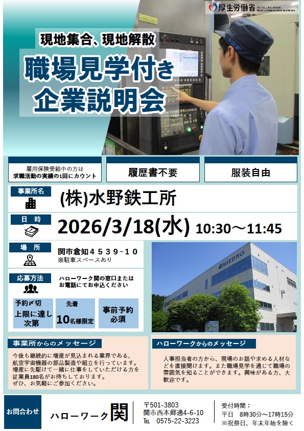 - 【ハローワーク関】3月18日 職場見学付き企業説明会のご案内