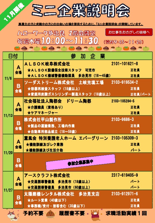 - 【ハローワーク多治見】ミニ企業説明会のご案内 ◆11月◆