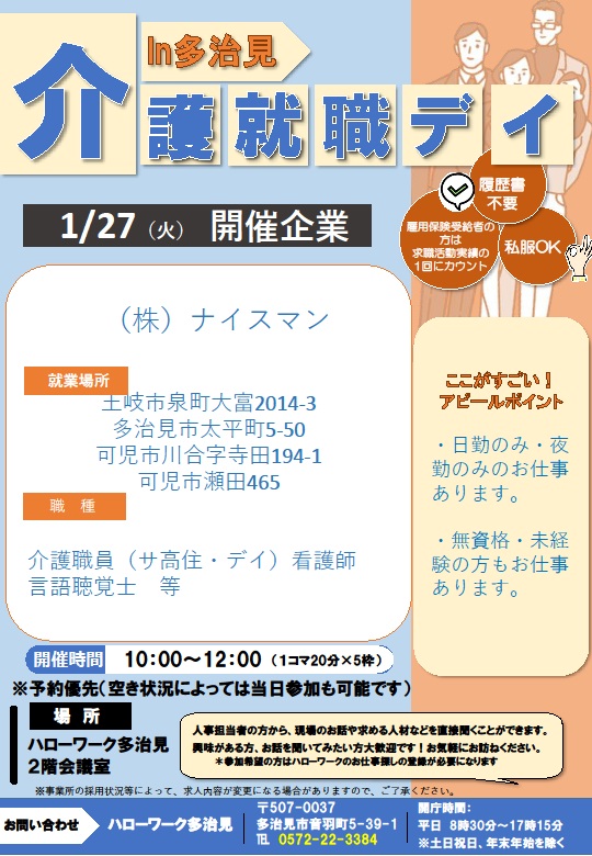 【ハローワーク多治見】1月27日 介護就職デイ in 多治見 のご案内
