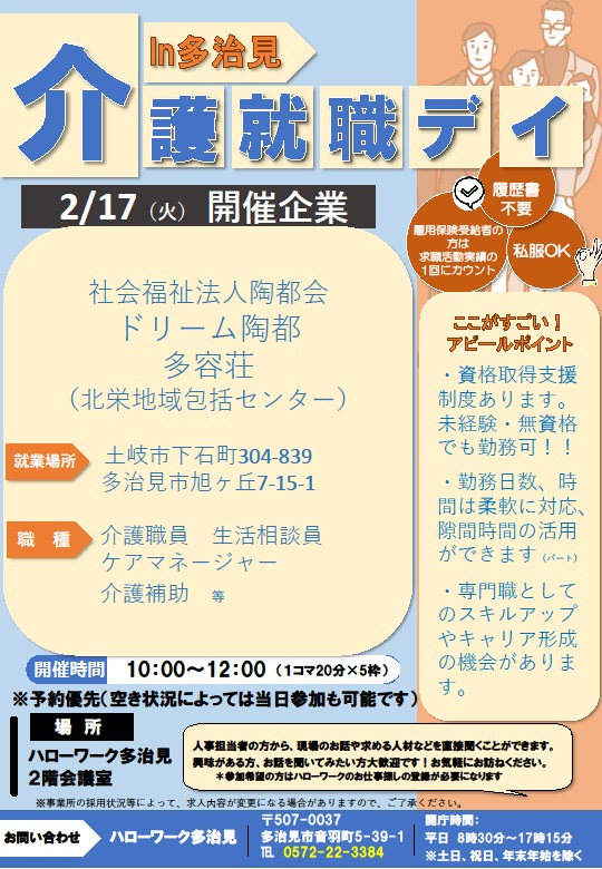 【ハローワーク多治見】2月17日 介護就職デイ in 多治見 のご案内