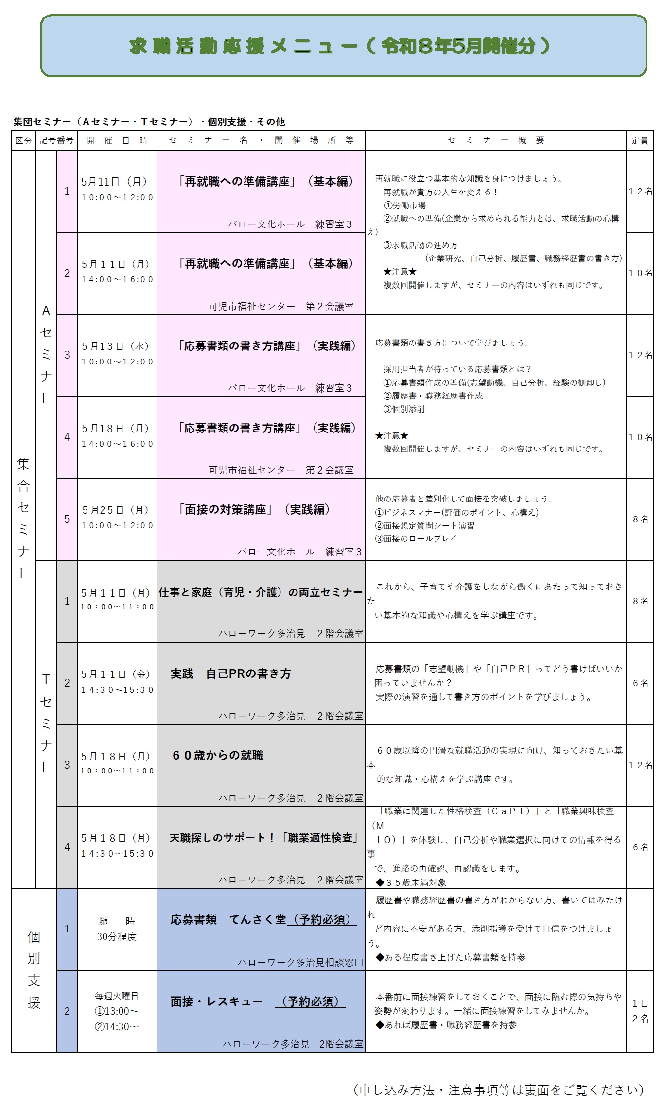 【ハローワーク多治見】求職活動応援メニューのご案内 ◆5月◆