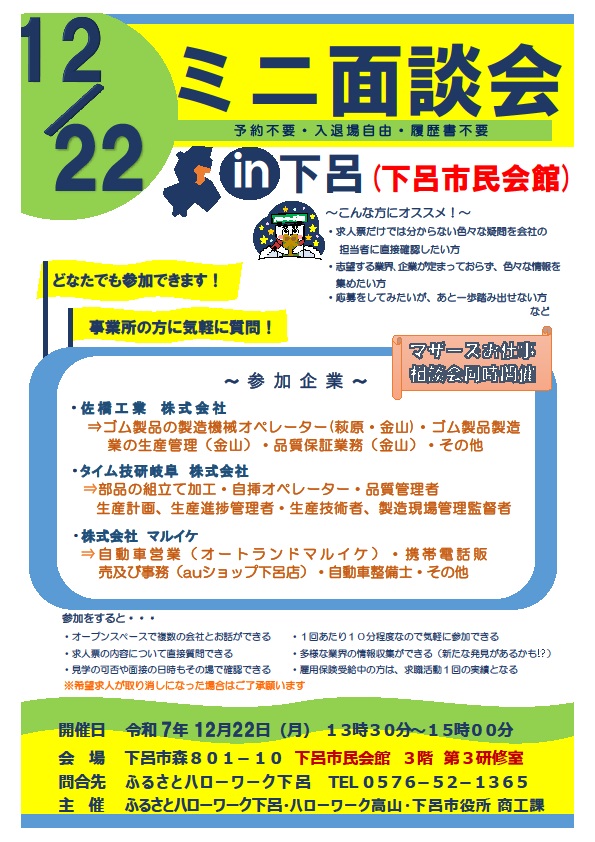 - 【ハローワーク高山】12月22日 ミニ面談会 in 下呂のご案内