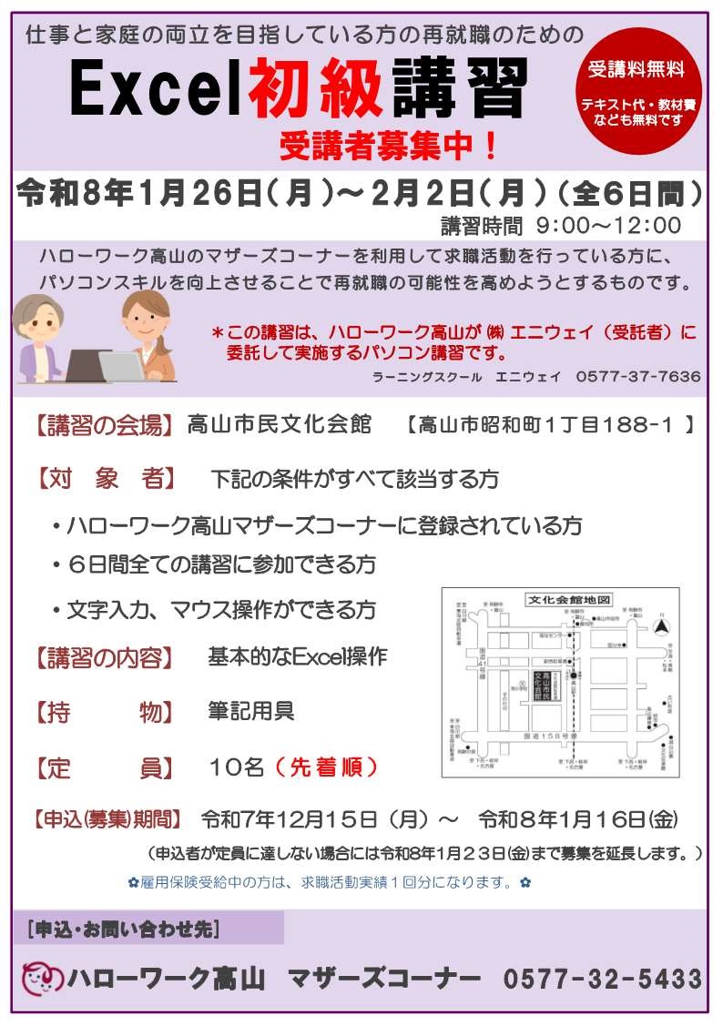 - 【ハローワーク高山】仕事と家庭の両立を目指している方の再就職のための【Excel初級講習】開催のご案内