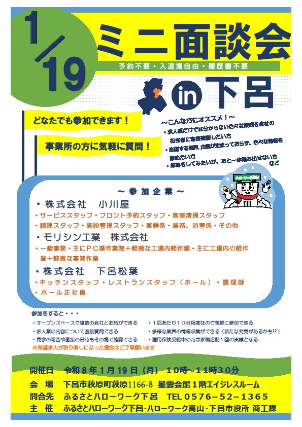 - 【ハローワーク高山】1月19日 ミニ面談会 in 下呂のご案内