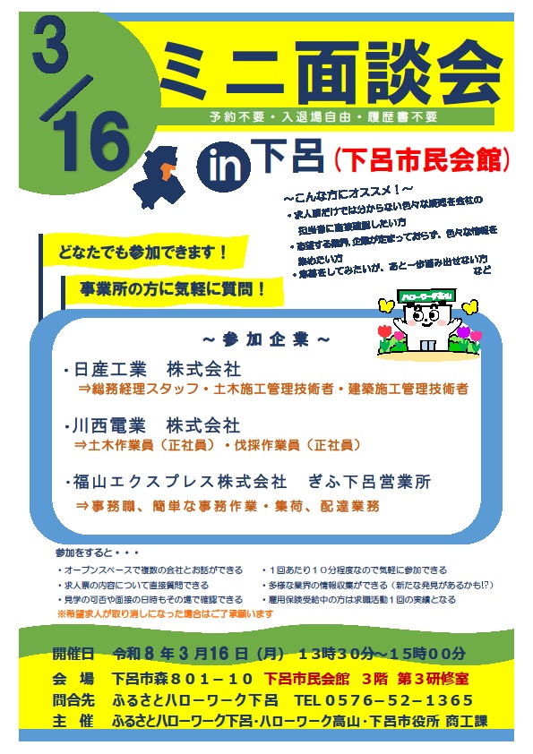 - 【ハローワーク高山】3月16日 ミニ面談会 in 下呂のご案内