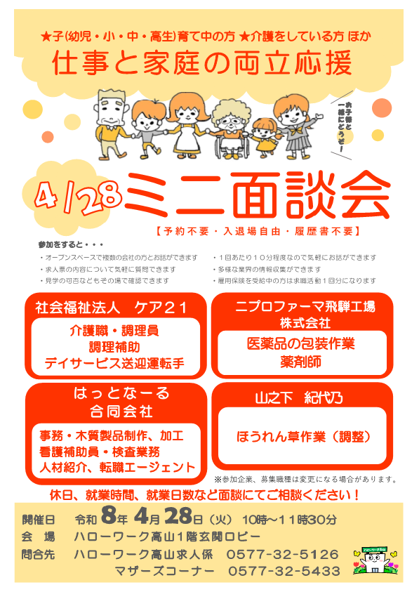 - 【ハローワーク高山】4月28日 仕事と家庭の両立を目指している方のための【ミニ面談会】のご案内