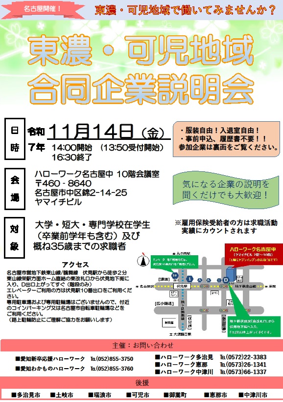 - 【ハローワーク恵那・多治見・中津川】東濃・可児地域合同企業説明会のご案内
