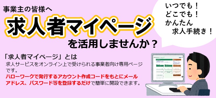 求人者マイページ開設に関するご相談は、求人窓口、電話またはメールにてご連絡ください。