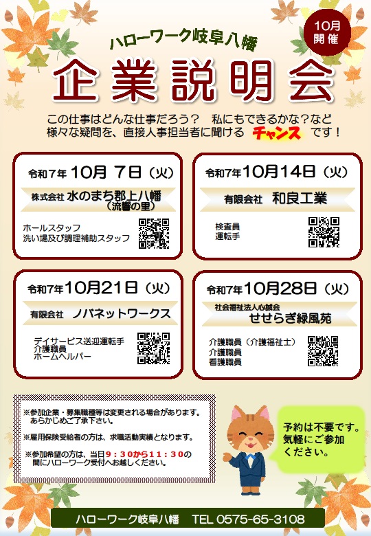 ※参加無料・事前申込不要・服装自由・入退室自由でご参加いただけます。お気軽にお越しください。 ※雇用保険受給中の方は求職活動実績となります。 主催:郡上市雇用対策協議会 共催:ハローワーク岐阜八幡 |