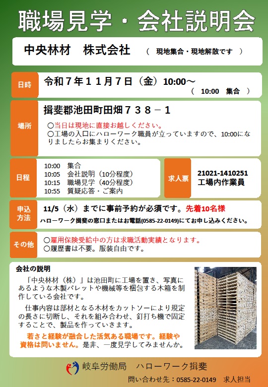 | 備 考 | ※現地集合、現地解散です。 ※事前予約制(先着順)です。ハローワーク揖斐の窓口またはお電話【TEL:0585-22-0149】にてお申し込みください。申込締切:11月5日(水) ※雇用保険受給中の方は求職活動実績となります。 |