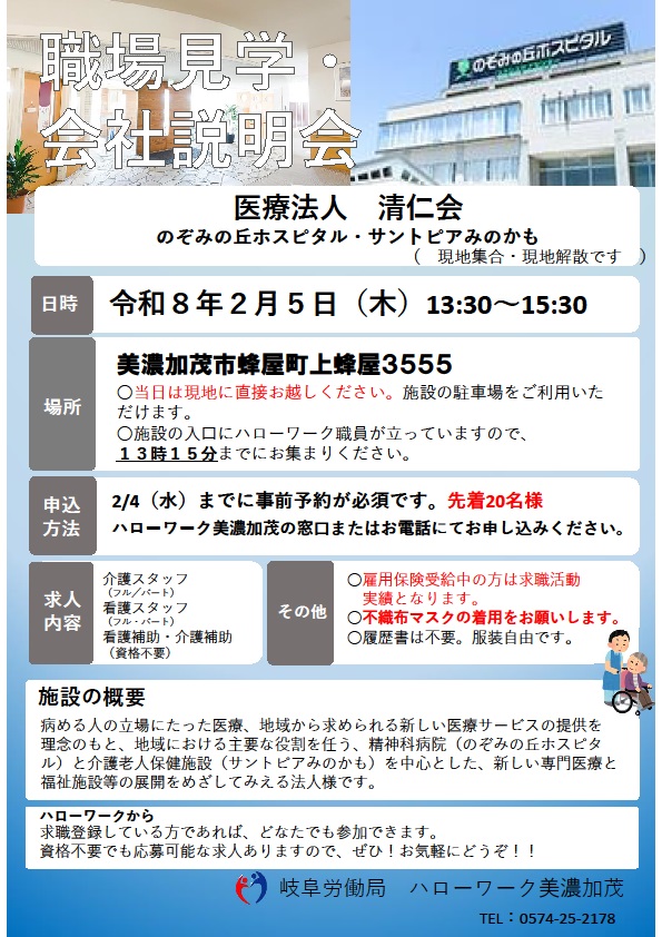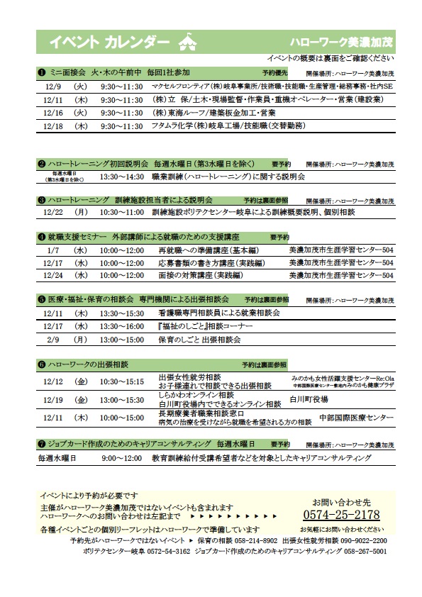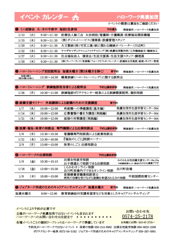 | 備 考 | ※事前予約制です。ハローワーク美濃加茂の窓口またはお電話【TEL:0574-25-2178】にてお申し込みください。上限に達し次第、予約締切となります。申込締切:2月4日(水) ※当日はマスクの着用をお願いします。 ※雇用保険受給中の方は求職活動実績になります。 |
