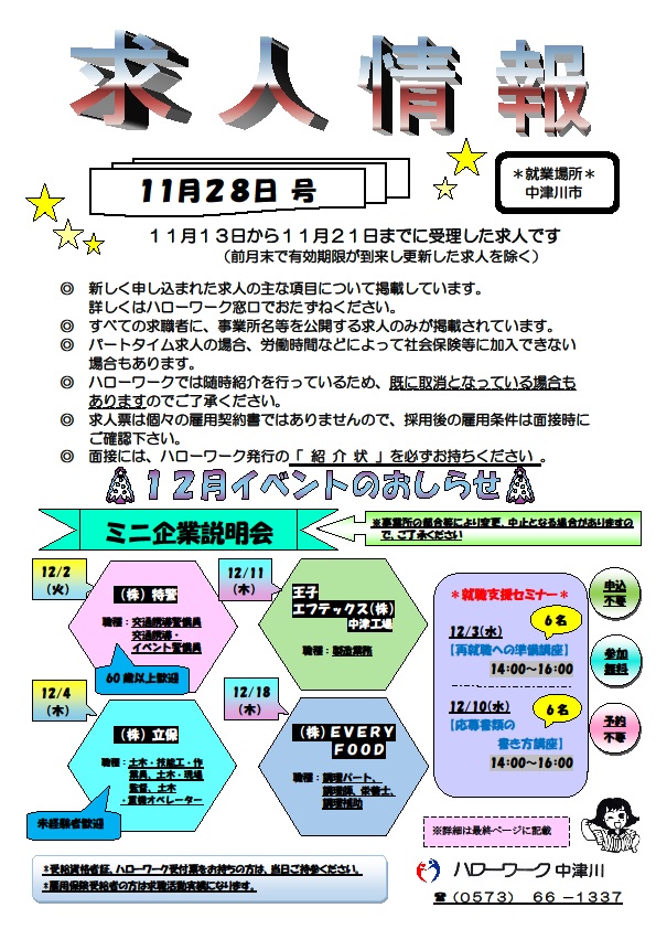 ハローワーク中津川で11月13日から11月21日までに受理した求人の情報になります。