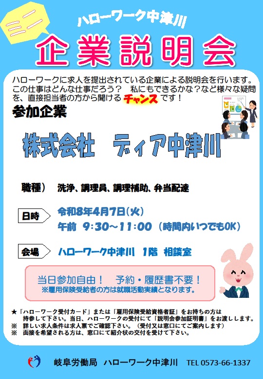 | 備 考 | 【お申込み・お問い合わせ先】 ハローワーク中津川 職業紹介部門 TEL:0573-66-1337 |