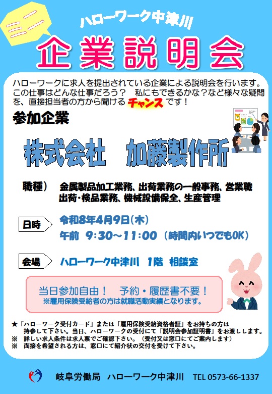 ・原則として、就業場所が中津川市内にあること ・「ミニ企業説明会」当日に有効中の求人があること ・過去2か月以内に「ミニ企業説明会」に参加していないこと |