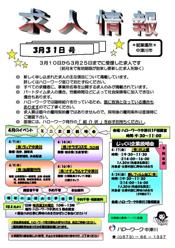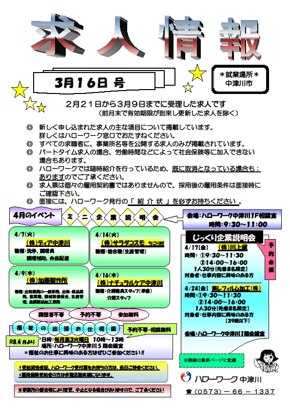 ハローワーク中津川で3月10日から3月25日までに受理した求人の情報になります。