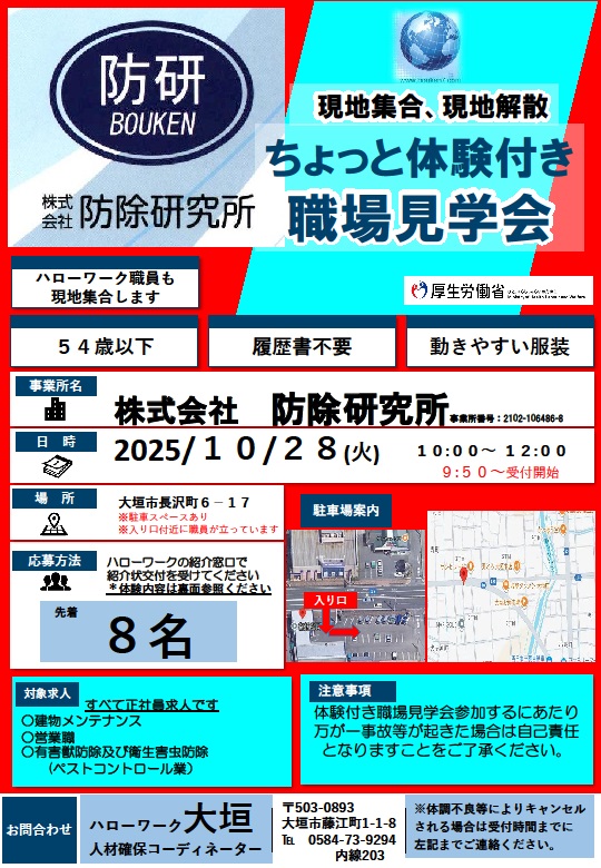 (株)防除研究所(大垣市長沢町6-17)に集合して「体験付き職場見学会」を開催します。