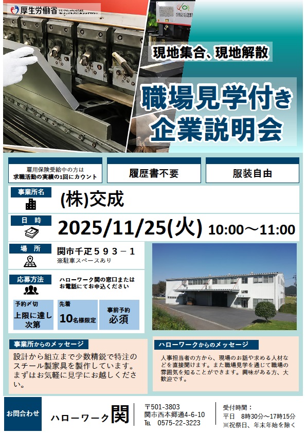 ・就業場所が原則として管内(関市・美濃市)にあること ・開催日に求人が有効中であること ※派遣求人は対象外となります  |