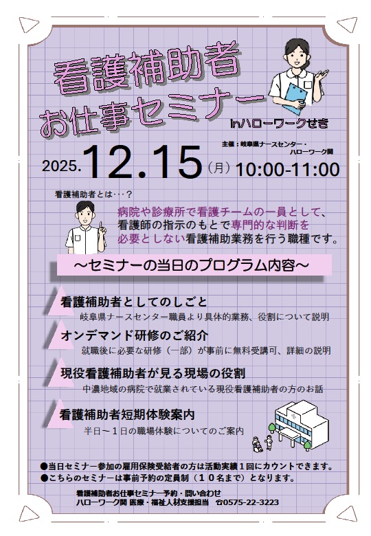 看護補助者お仕事セミナー in ハローワーク関のご案内
