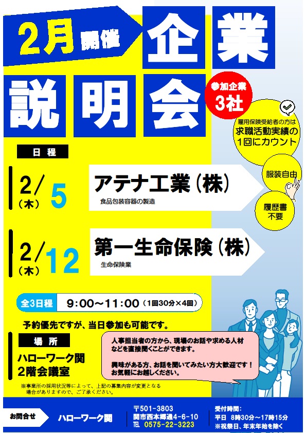 ・就業場所が原則として管内(関市・美濃市)にあること ・開催日に求人が有効中であること ※派遣求人は対象外となります |