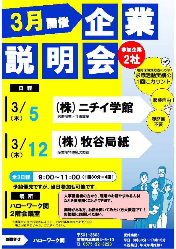 ※事前予約制です。ハローワーク関の窓口またはお電話【TEL:0575-22-3223】にてお申し込みください。上限に達し次第、予約締切となります。