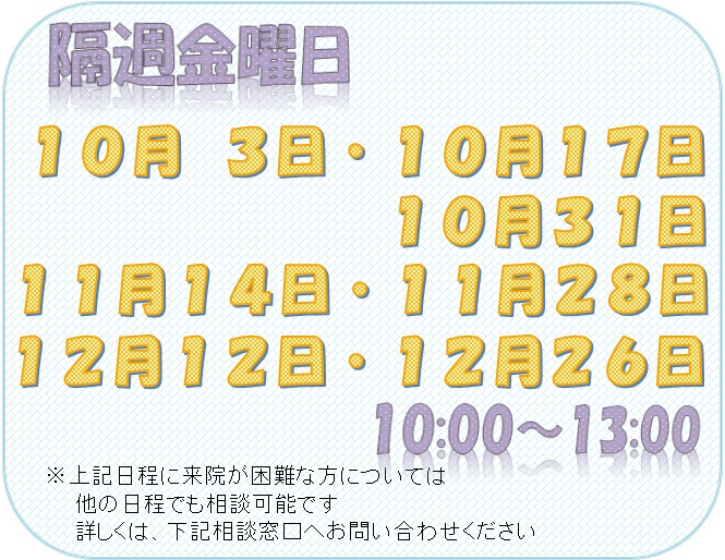 また、事前予約者を優先に相談を行っておりますが、予約状況に応じて随時相談を行いますので、お気軽にお尋ねください。