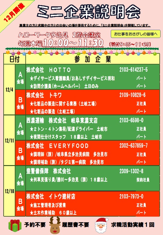 ハローワーク多治見では、ハローワークへ求人募集を行っている企業との出会いの場として『ミニ企業説明会』を開催しています。