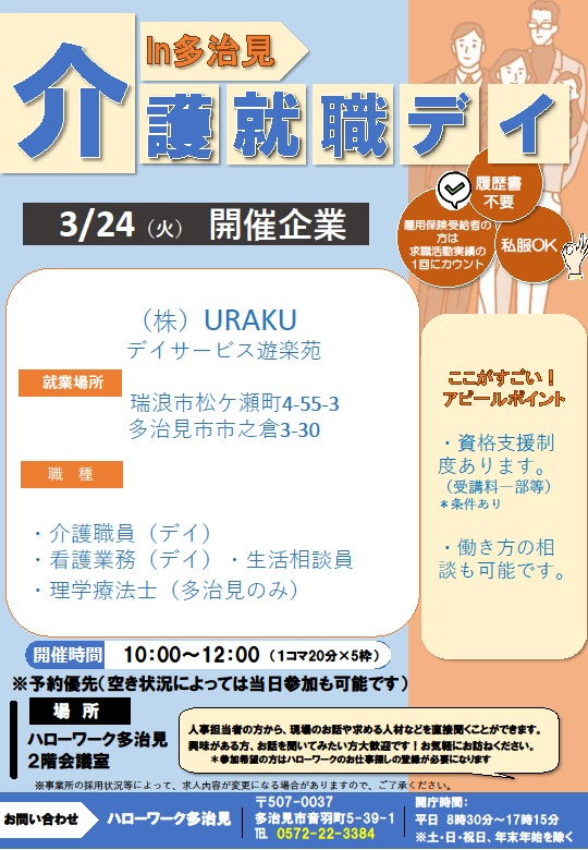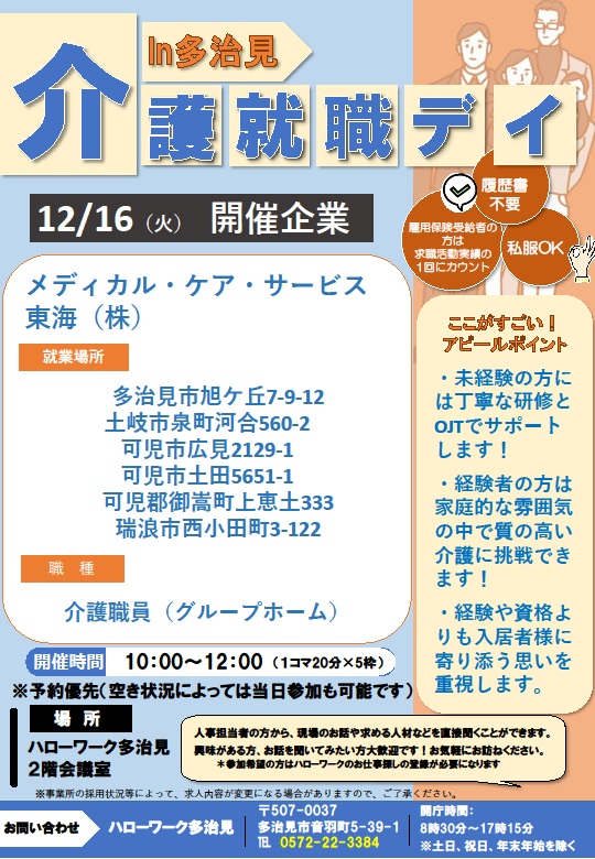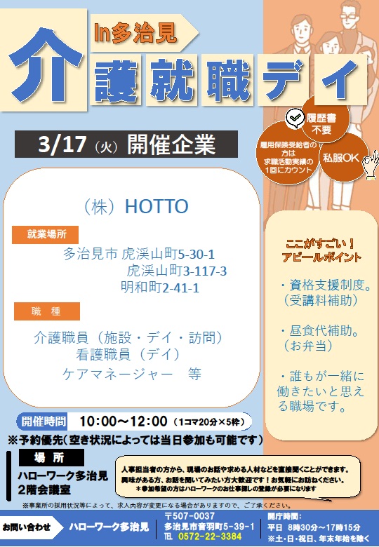 介護関係の事業所担当者と直接お話ができる介護就職デイ in 多治見を開催しています。(事前予約制)